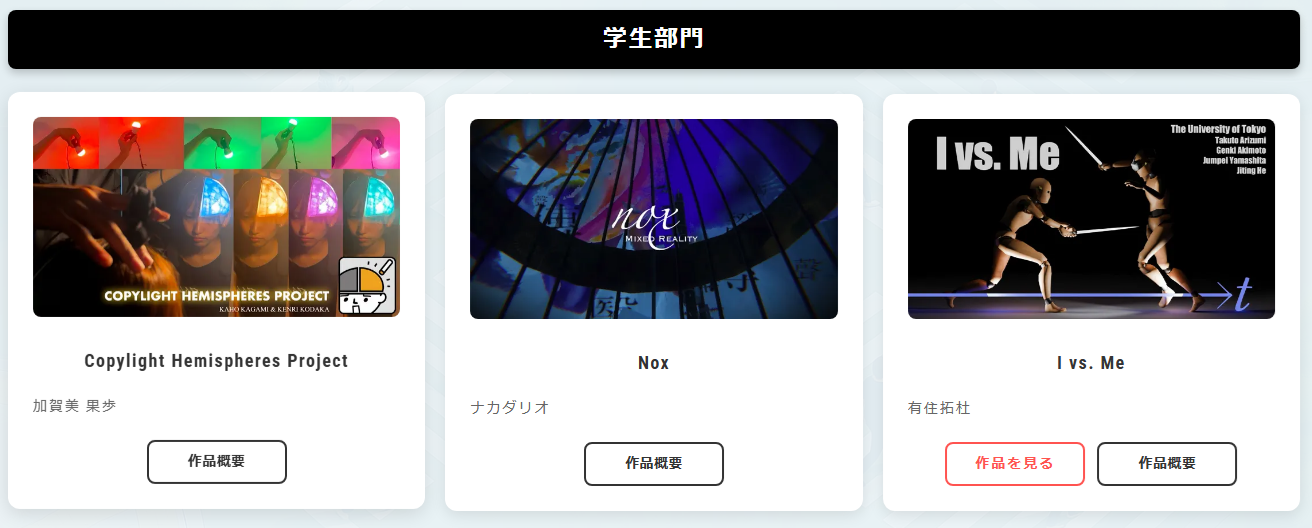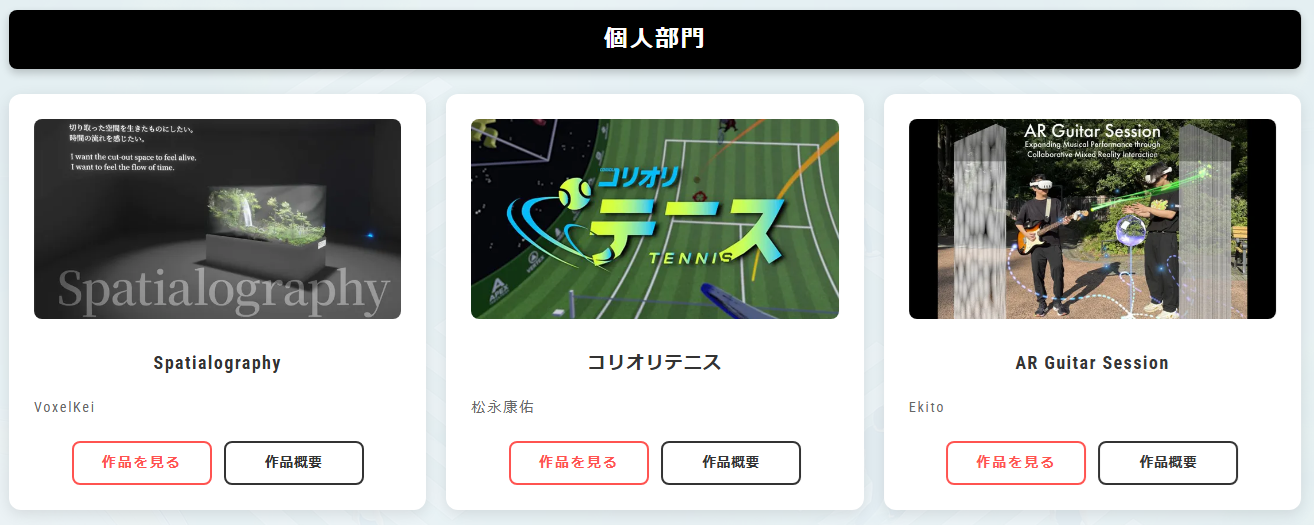 ※「作品」としていますが、ゲーム・エンターテイメント・産業活用・建築・教育・アート・サイエンスなど、XRを使ったあらゆる作品・コンテンツ・アプリケーション・プロジェクトを対象とします。